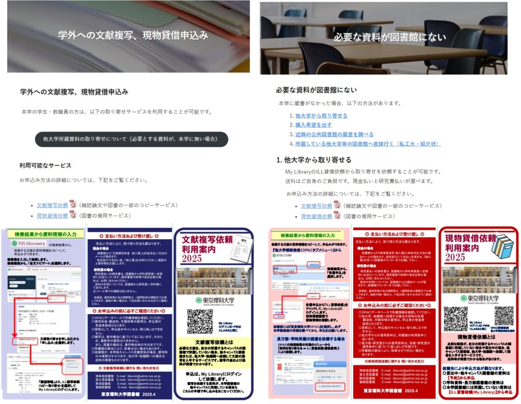 『My Libaryの利用』『学外への文献複写、現物貸借申込み』および『必要な資料が図書館にない』のページを更新して、新しく改訂したリーフレットも公開いたしました。申込の際にご利用ください。