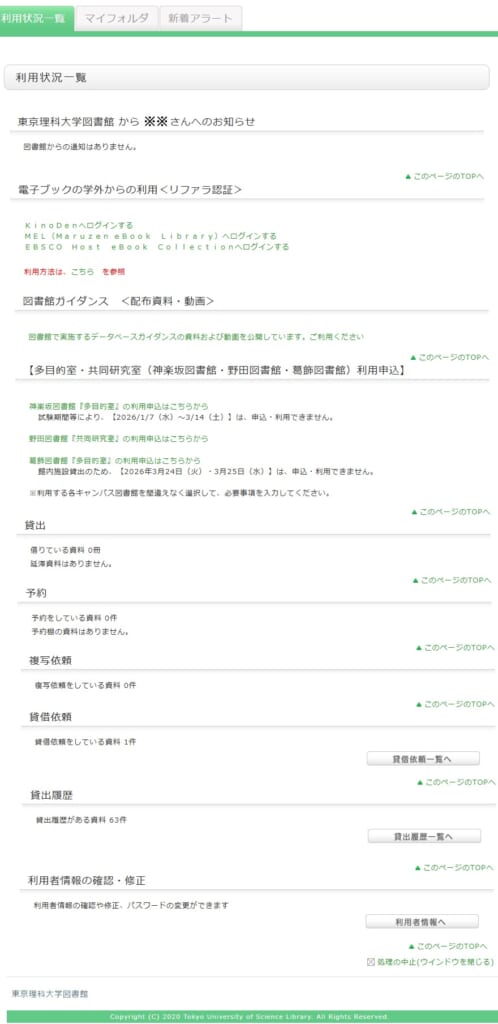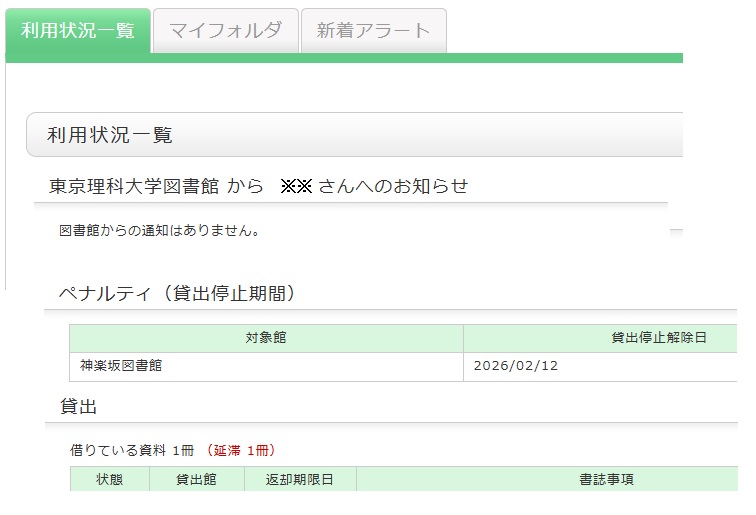 貸出停止期間がついている場合、「利用状況一覧」から解除日が確認できます。