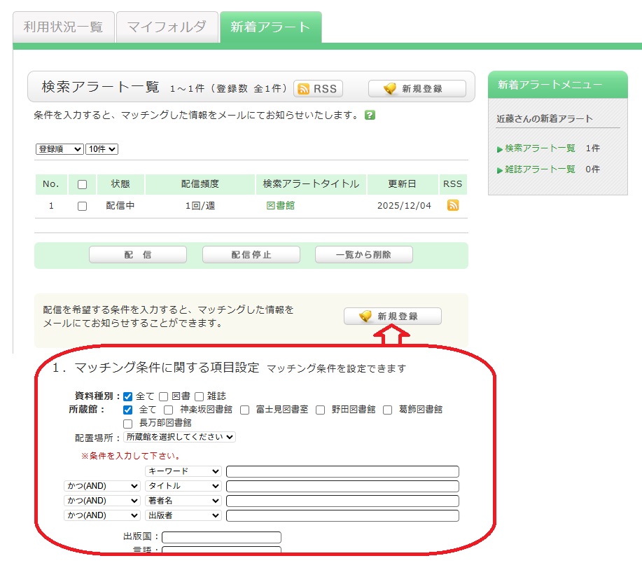 検索キーワードを登録すると定期的にマッチングした情報をメールで連絡します。